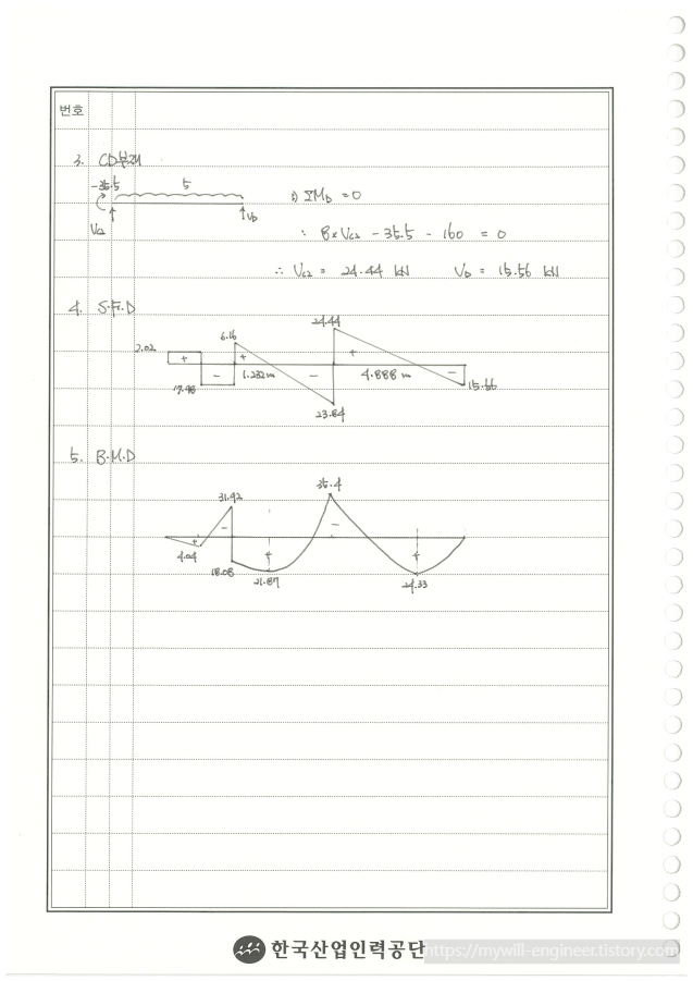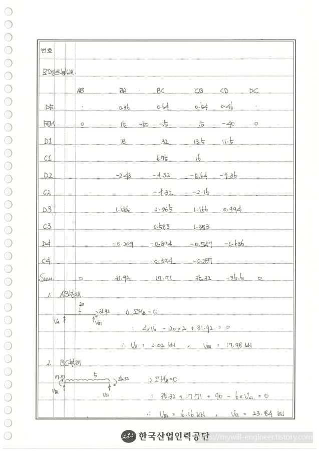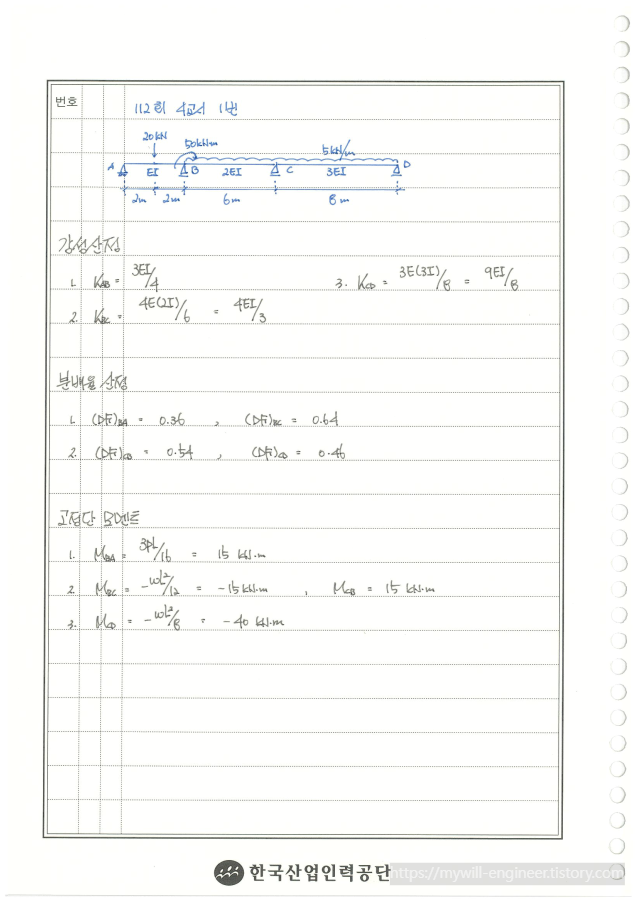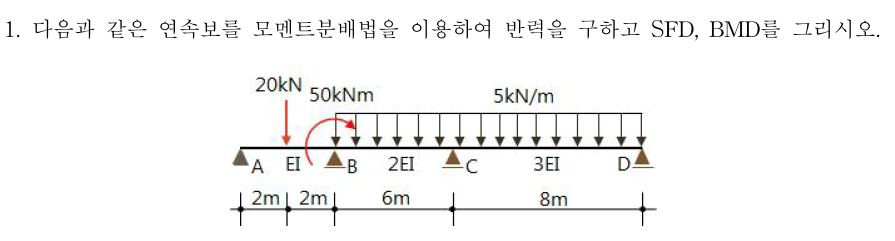 2. 모멘트분배법으로 풀이를 요구하는 문제입니다. 절점에 작용하는 모멘트를 어떤식으로 해결해야 하는지 고민이 필요한 문제입니다.