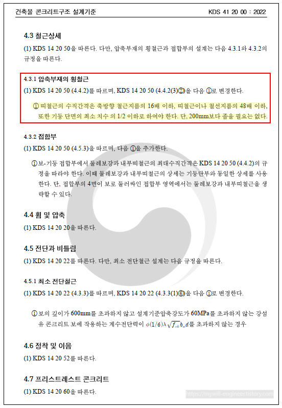 위의 기준을 확인해보면 압축부재의 횡철근에 대한 규정이 "변경" 되어 있음을 확인 할 수 있습니다.