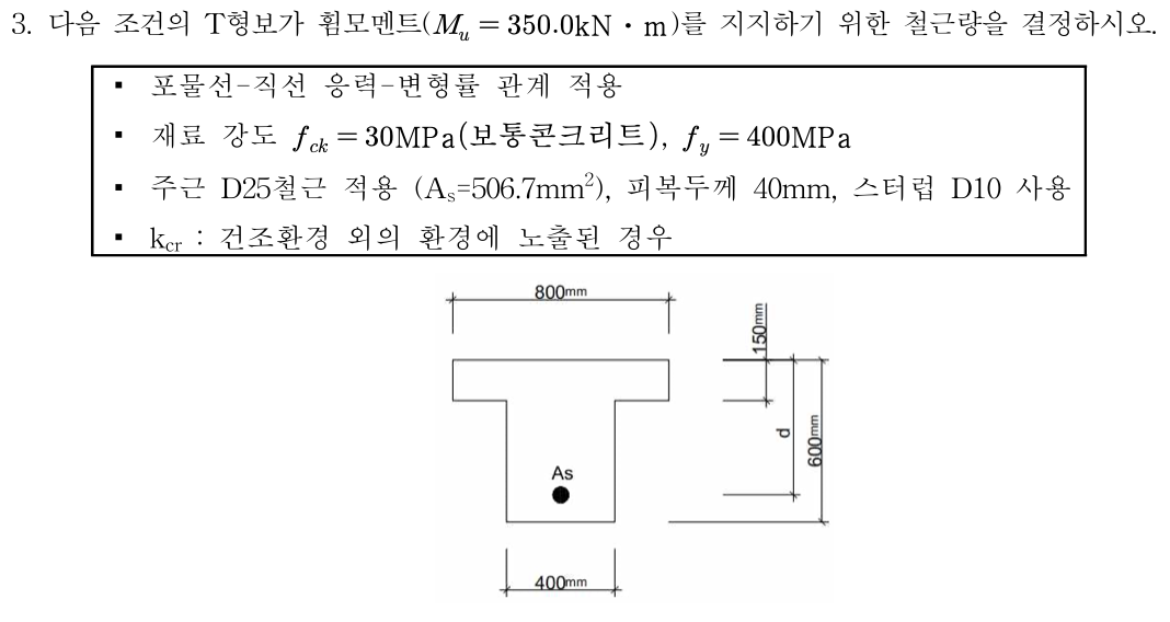 2. 주어진 T형보 단변을 바탕으로 소요모멘트를 저항할 수 있는 철근량을 산출하라는 문제입니다.