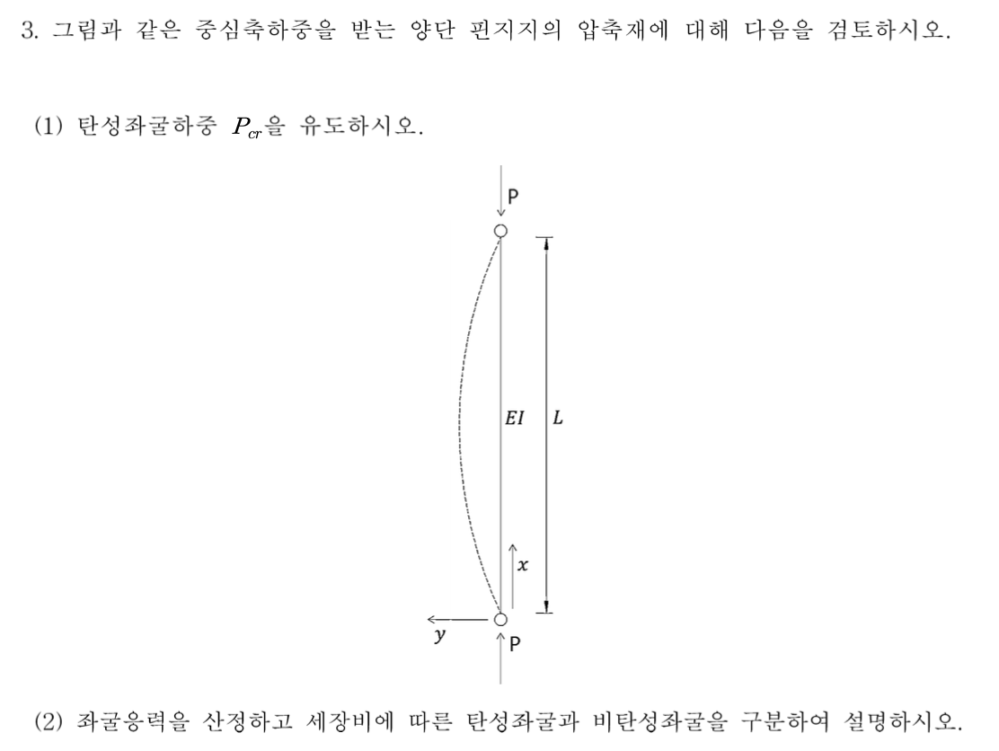 2. 탄성좌굴하중 유도 및 좌굴응력 산정을 요하는 문제입니다.