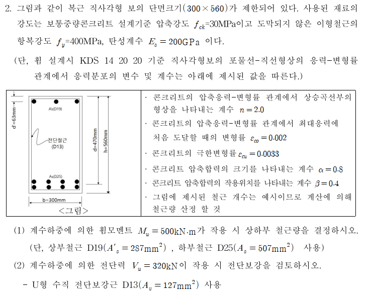 2. 주어진 설계조건을 바탕으로 보의 휨강도 및 전단강도를 산정할 수 있어야 합니다.