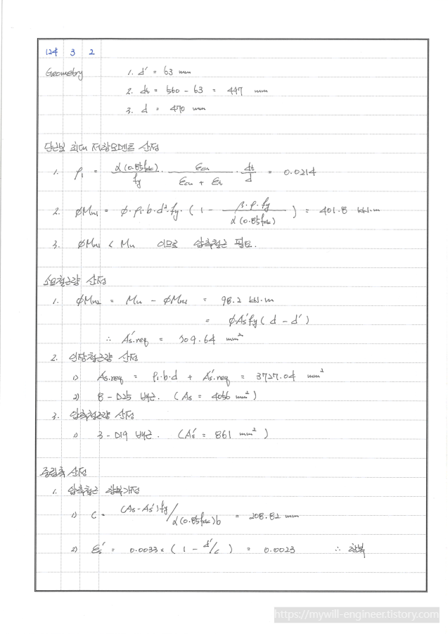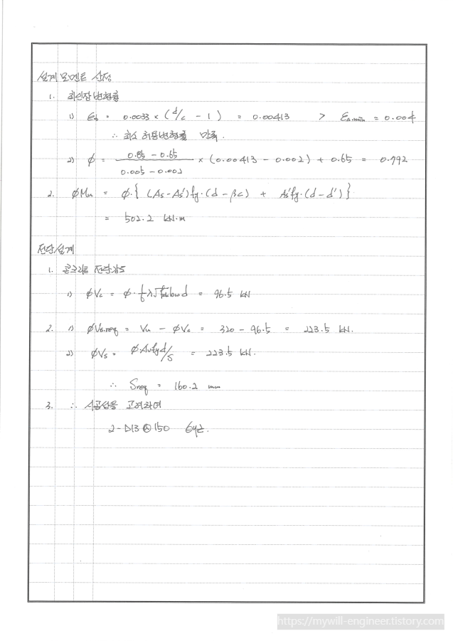 3. 개정된 기준으로 풀이를 요구하고 있으며, 철근배근의 적정성 검토는 생략했습니다.