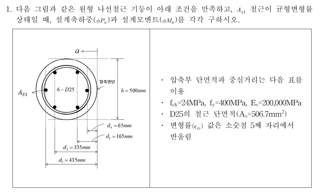 2. 원형단면에 대한 기둥해석을 묻는 문제로 주어진 표에 대한 이해가 필요합니다.