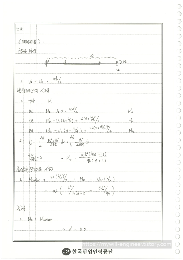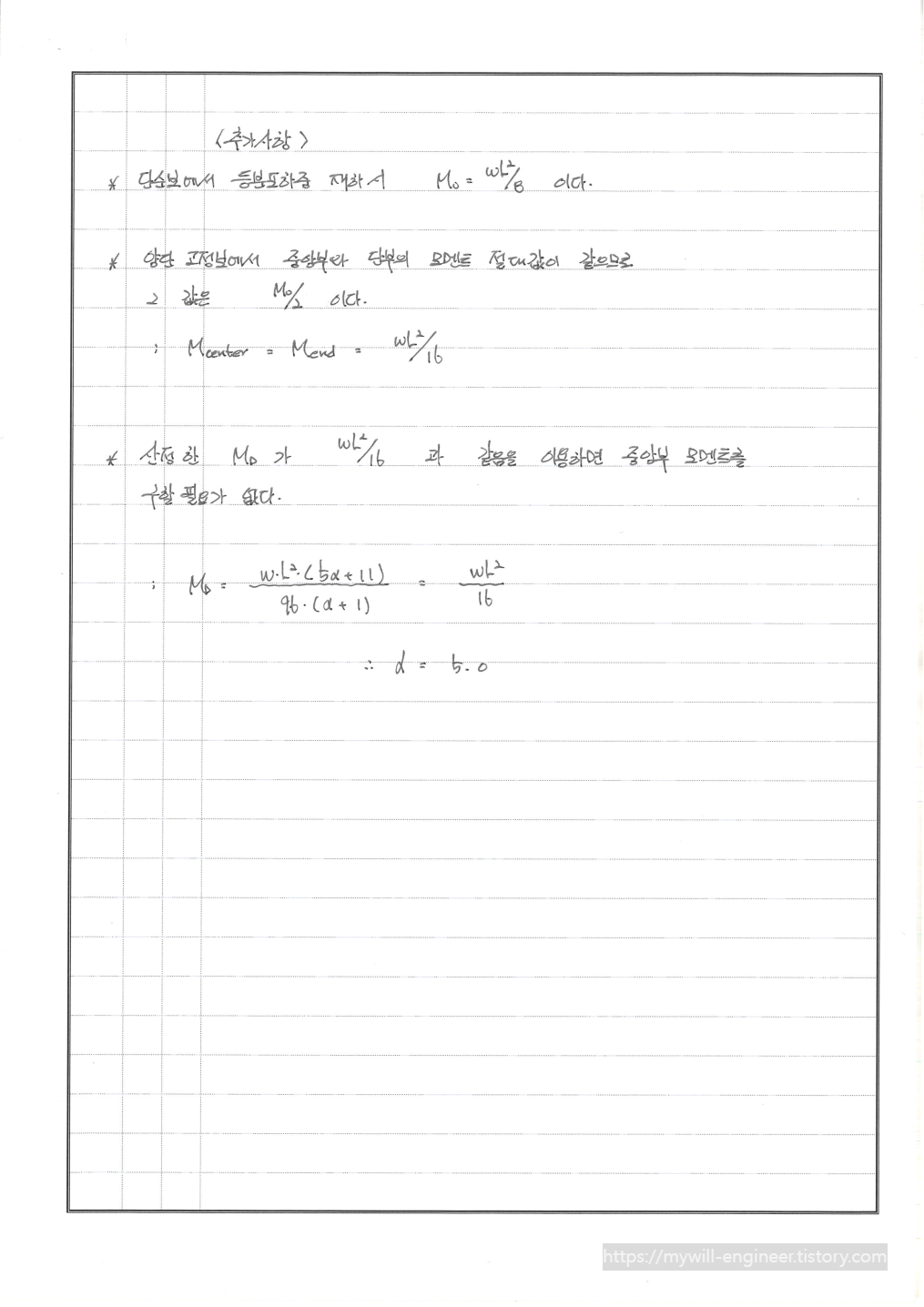 2. 양단 고정인 보는 2차 부정정이지만, 좌우 대칭성을 활용하면 1차 부정정으로 풀 수 있습니다. (양단 지점 반력이 동일)