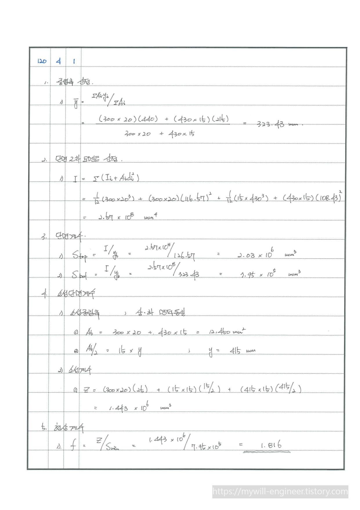 - 중립축을 기준으로 단면 상, 하부 끝에서의 단면계수 산정 (가로축에 비대칭 단면이므로 단면계수는 상, 하부 2개가 나옴)
