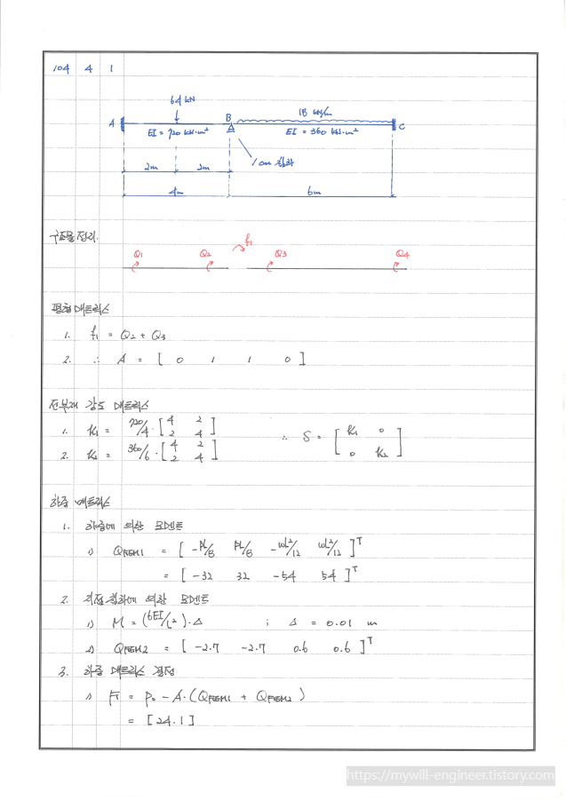 2. 매트릭스법으로 풀이를 요구하는 문제입니다. 지점침하가 추가되는 문제는 좀 생소할 수 있습니다.