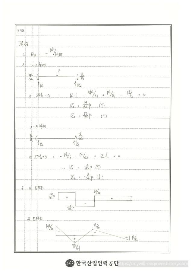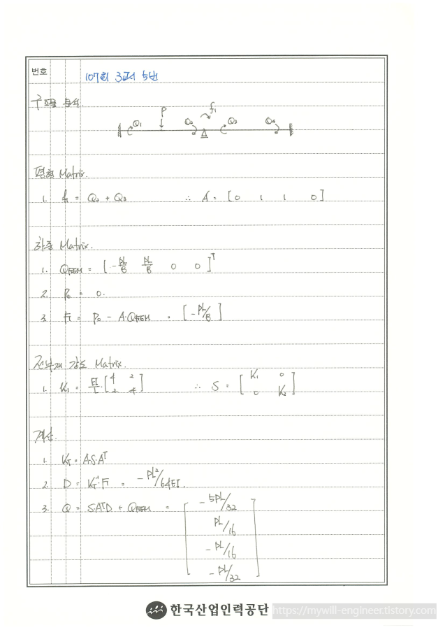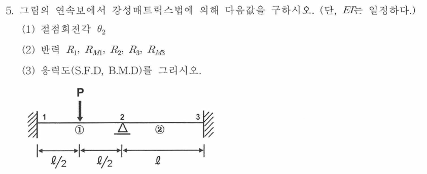 2. 강성매트릭스법을 묻는 가장 기본적인 문제입니다. 기본 개념을 정리하기에 좋은 문제이며, 절점의 자유도 수가 적고 부정정 차수가 높은 문제일 수록 매트릭스법을 적용하는게 좋을 듯 합니다.