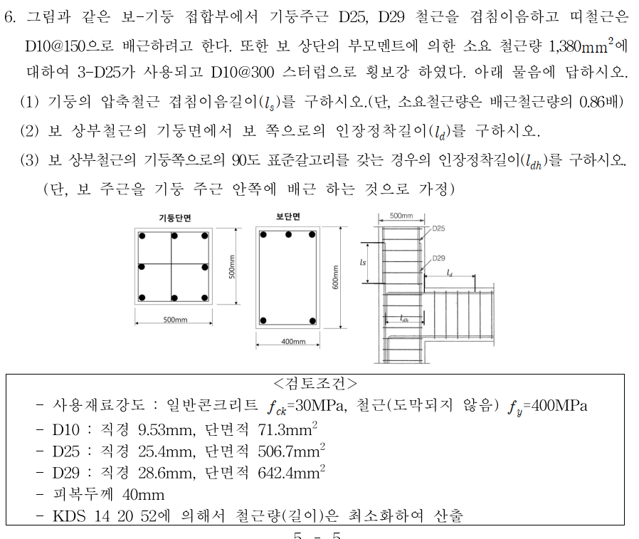 2. 정착과 이음관련 된 문제에서 낼 수 있는 최종장인 느낌입니다. 문제에서 주어지는 철근 직경과 단면도 모두 소수점으로 주어진 것으로 보아 난이도를 의도적으로 높게 낸 문제인 것 같습니다. (정해진 시간안에 풀기 위해서는 정말 많은 반복과 명확한 개념이 필요할 것으로 생각됩니다.)